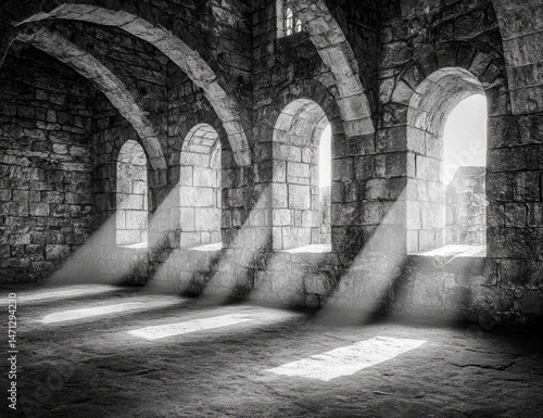 Obraz premium Ancient stone arches, light streaming through windows. Sunlight illuminating interior of a historical building