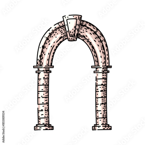 © PikePicture, Naklejka premium Ancient stone archway featuring two columns supporting an arch, illustrating an architectural element with a vintage hand drawing style and textured details