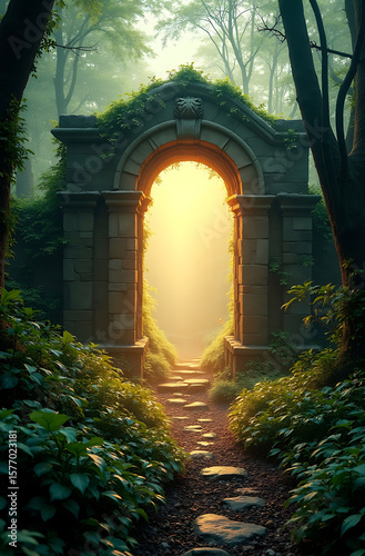 Obraz premium Ancient stone archway in a lush forest, sunlight beams through, mystical path.
