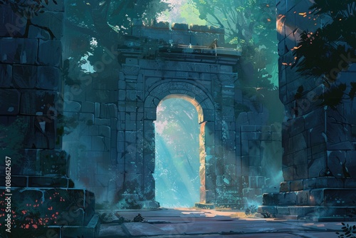 © boler, Fototapeta premium Ancient Stone Archway Leading to a Sunlit Forest Path