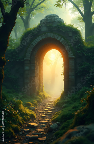© NN, Fototapeta premium Ancient stone archway leads into a mystical forest path bathed in sunlight.