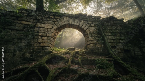 © addymawy, Fototapeta premium Ancient Stone Archway Overgrown with Moss and Vines in a Sunlit Forest