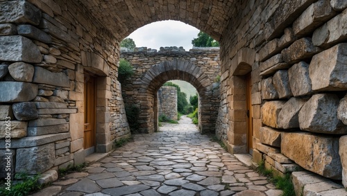Fototapeta premium Ancient stone archway pathway with wooden doors and cobblestone surface...