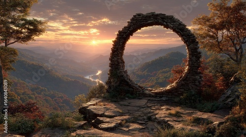 Fototapeta premium Ancient stone archway, sunrise over valley