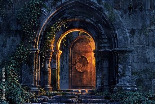 Naklejka premium Ancient stone archway with a glowing wooden door, surrounded by lush...