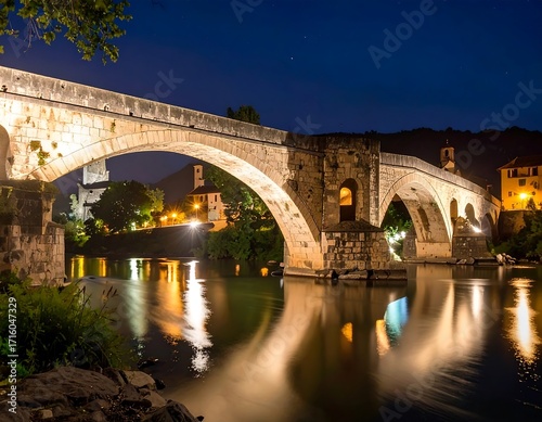 Obraz premium Ancient stone bridge at night, reflecting in calm river