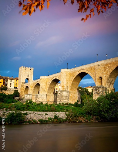 © Makin, Fototapeta premium Ancient stone bridge over a river at sunset