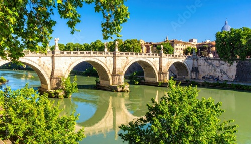 Fototapeta premium Ancient stone bridge over a river, lush greenery