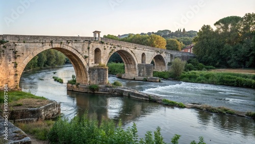 Naklejka premium Ancient stone bridge over a serene river, rural bridge, stone bridge, gentle...