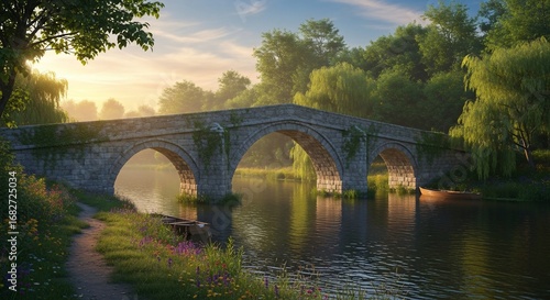 © MUHAMMADADIALFARIS, Fototapeta premium Ancient stone bridge over calm river at sunrise.