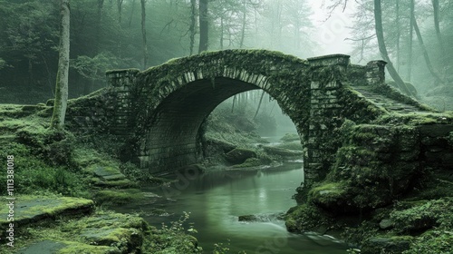 © Rere_Art151, Fototapeta premium Ancient Stone Bridge Over Mossy Forest Stream
