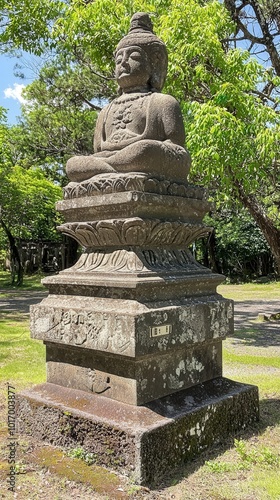 Fototapeta premium Ancient stone Buddha statue surrounded by lush greenery in a tranquil park...