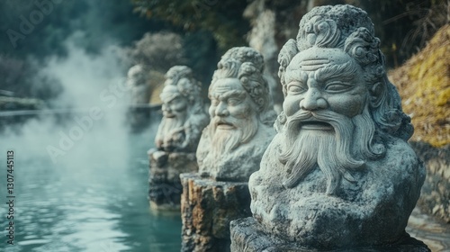 Fototapeta premium Ancient stone busts by hot spring, misty mountain background