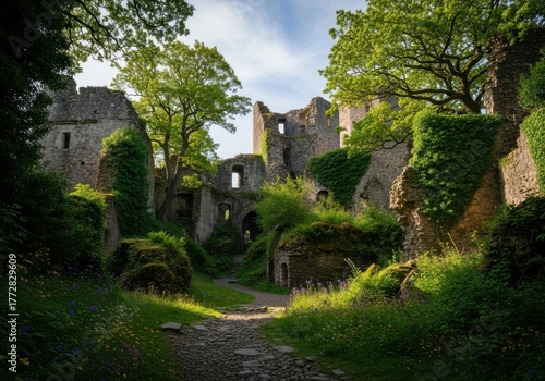 © Habiba, Fototapeta premium Ancient stone castle ruins overgrown with lush green ivy and trees, bathed in soft sunlight on a clear day