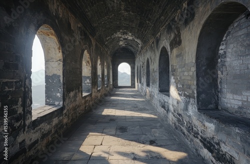 Naklejka premium Ancient stone corridor with arched windows, sunlight streaks