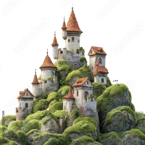 Fototapeta premium Ancient stone fortress with mossy towers perched atop a rugged, verdant hill
