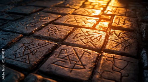 © STwul, Fototapeta premium Ancient stone pathway glyphs sunset mystery game