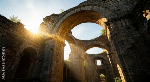 Fototapeta premium Ancient Stone Ruins with Arched Windows and Sunlight Streaming Through in...