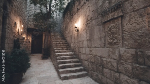 © Alexey, Fototapeta premium Ancient stone staircase in medieval castle dungeon. Flickering torches illuminate mysterious corridor. Archeological site exploration. Historical architecture concept