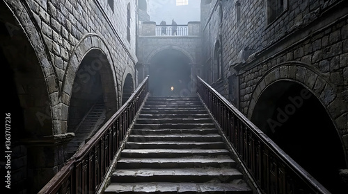 © artzone, Obraz premium Ancient Stone Staircase Leads Through Dark Tunnel Lit with Light