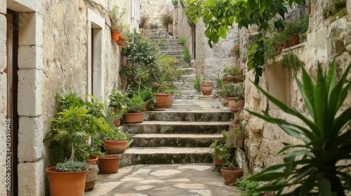 © Rauf, Fototapeta premium Ancient stone stairs with greenery. Rustic stone staircase covered with small green plants, leading to a medieval setting. Weathered texture of stones adds charm to the historical atmosphere.
