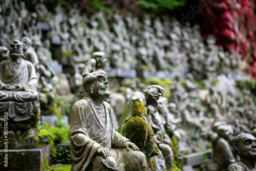 © Pierre, Obraz premium Ancient stone statues of Rakan, Japan, in a mossy hillside setting
