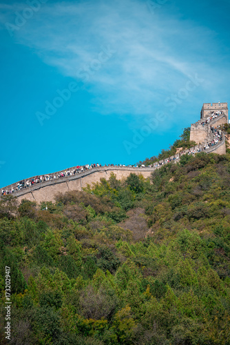 © YiuCheung, Fototapeta premium Ancient stone steps ascend a weathered, gray Great Wall winding through a lush, green landscape near Beijing, showcasing a historic defensive structure for travel and tours.