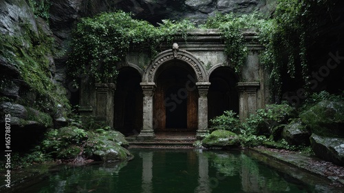Fototapeta premium Ancient stone structure, overgrown with vines, reflecting in a dark pool