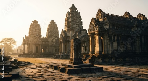 Fototapeta premium Ancient stone structures, bathed in golden sunrise light, stand majestically in a serene Asian temple complex