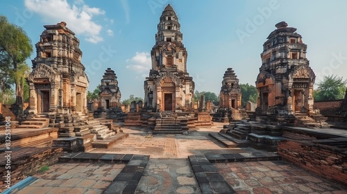 © tinnakorn, Naklejka premium Ancient stone temple complex with intricate carvings under a clear blue sky.