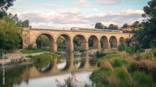 © arthit, Fototapeta premium Ancient Stone Train Crossing Over River Landscape