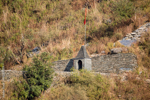 © Harshi & Kashi, Fototapeta premium Ancient structure at a hillside location with a flag flying above in daylight