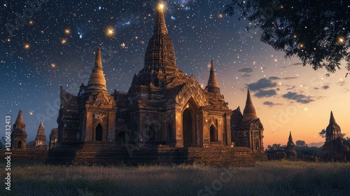 © harryaishi, Fototapeta premium Ancient temple at night, stars, sunset.