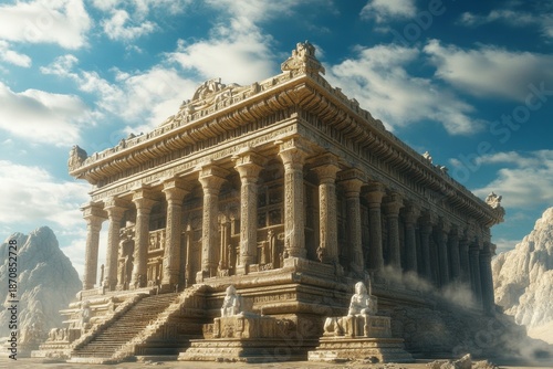 Obraz premium Ancient temple built from stone in a majestic mountain landscape under bright...