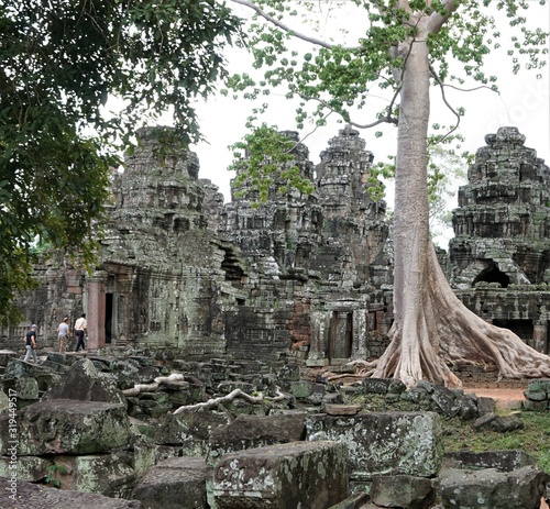 Fototapeta premium Ancient temple complex, big tree overgrow the old Stones and some tourists...