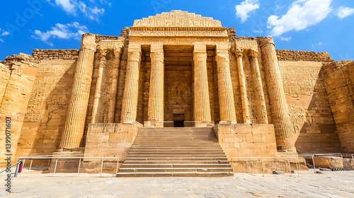 © Biggy, Obraz premium Ancient Temple Exterior with Tall Columns and Stone Steps Under Bright Blue Sky