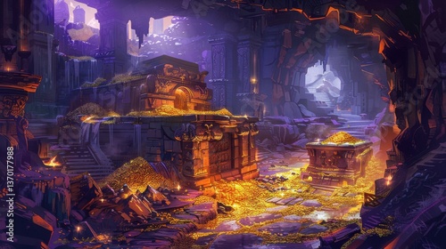 © Chinases, Obraz premium Ancient temple ruin filled with piles of gold coins and treasures in a cavern, with mysterious archways, steps, and fantasy elements.