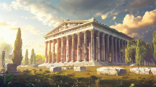 © Patwarin, Obraz premium Ancient temple with columns, surrounded by greenery and rocks, under dramatic sky