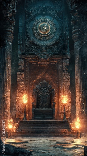 © Kitta Studio, Obraz premium Ancient Throne Room with Illuminated Torches in Dark Setting