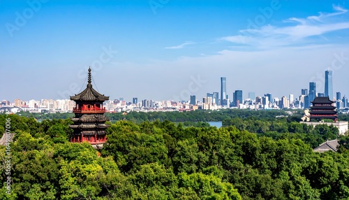 © Cintaiaku, Fototapeta premium Ancient tower overlooking modern city