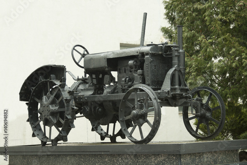 Fototapeta premium Ancient tractor monument stands on a pedestal