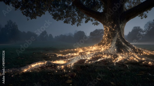 Fototapeta premium Ancient tree roots illuminate a mystical forest clearing during twilight hours