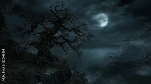 © Big9869, Fototapeta premium Ancient Twisted Tree Night Landscape Full Moon Dark Mountains