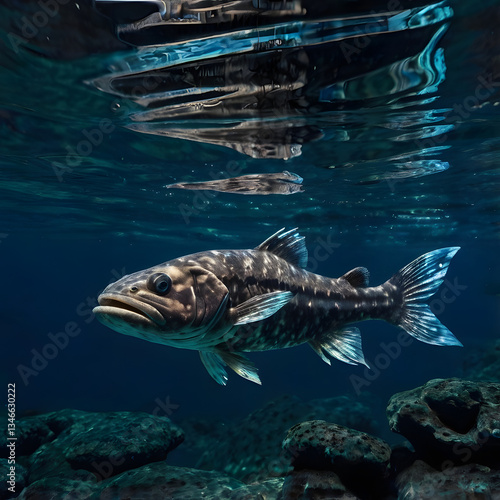 Fototapeta premium Ancient Underwater Sentinel: Capturing a coelacanth, a prehistoric wonder...