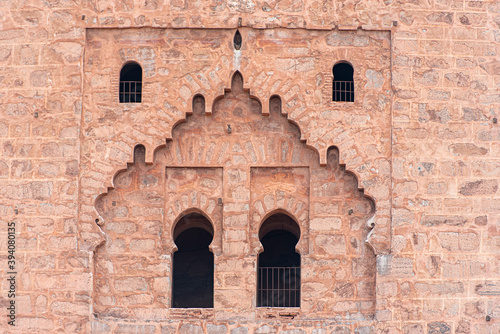 Naklejka premium Ancient walls of medina in Marrakech, part of Kutubiyya mosque, arabian style of doors and windows, buildings by red clay, Morocco