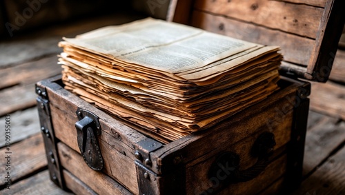 © Artem, Obraz premium Ancient wooden chest with faded historical papers