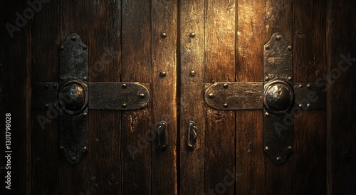 Fototapeta premium Ancient wooden double doors, dimly lit interior, historical ambiance, background image, stock photo