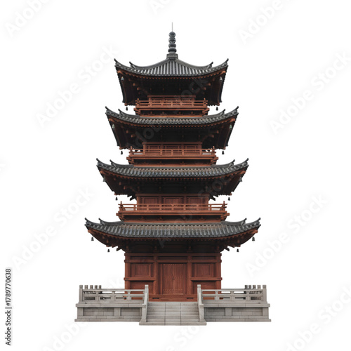 © Hansen, Fototapeta premium Ancient Wooden Pagoda Tower With Multi Tiered Roof And Stone Steps In Natural Lighting Isolated On Black Background