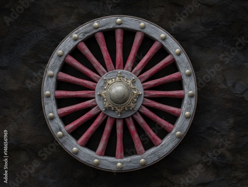 Naklejka premium Ancient Wooden Wheel: Red Spokes, Grey Rim, Dark Background