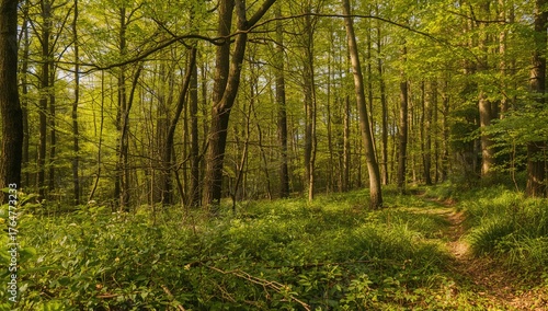 Fototapeta premium Ancient woodland with lush green foliage and blooming plants under spring...